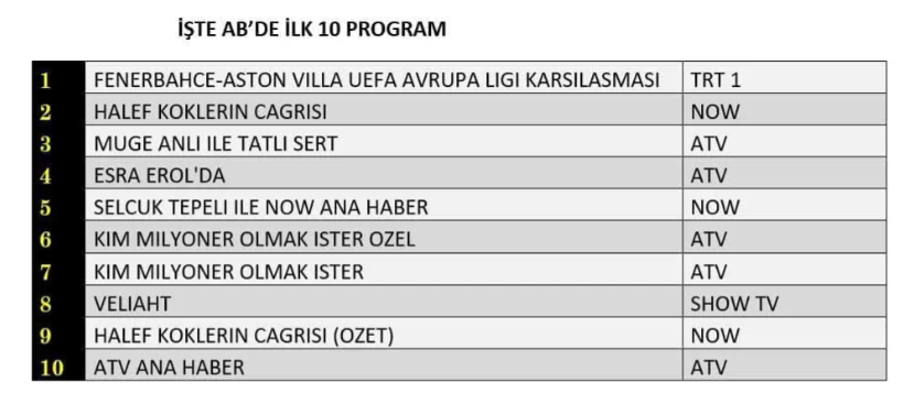 AB izleyici grubunda da 22 Ocak 2026 Perşembe gününün reyting lideri değişmedi. Futbol tutkunlarını ekran başına toplayan “Fenerbahçe-Aston Villa UEFA Avrupa Ligi Karşılaşması”, yüksek izlenme oranlarıyla AB kategorisinde de zirvenin sahibi oldu. Güçlü hikâyesi ve dikkatleri üzerine çeken anlatımıyla ön plana çıkan “Halef: Köklerin Çağrısı” dizisi, gecenin en çok izlenen ikinci yapımı olurken, gündüz kuşağının uzun soluklu ve istikrarlı programı “Müge Anlı ile Tatlı Sert” ise AB grubunda üçüncü sıraya yerleşti.