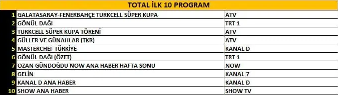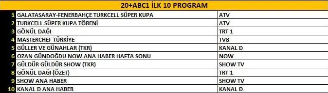 ABC1 grubunda gecenin zirvesine Galatasaray – Fenerbahçe Süper Kupa Finali yerleşti. Büyük çekişmeye sahne olan karşılaşma, futbolseverlerin yoğun ilgisini gördü. Futbol karşılaşmasının hemen ardından ekrana gelen Kupa Töreni ikinci sırada yer alırken, Gönül Dağı isimli fenomen dizi ise güçlü rekabete rağmen üçüncü sıradan listeye girmeyi başardı.