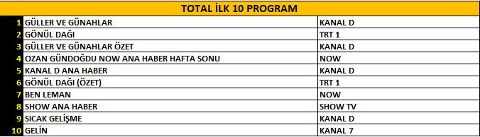 13 Aralık 2025 Cumartesi gününe ait reyting sonuçları belli oldu. Total kategorisinde, yayınlandığı ilk günden bu yana güçlü izleyici kitlesini koruyan “Güller ve Günahlar” bir kez daha zirvenin sahibi oldu. Uzun soluklu başarısıyla dikkat çeken ve altı sezondur ekranlarda yer alan “Gönül Dağı” günü ikinci sırada tamamlarken, “Güller ve Günahlar”ın özet bölümü de yüksek izlenme oranıyla üçüncü sıraya yerleşti. Bu reyting sonuçları, her iki başarılı dizinin de cumartesi akşamları izleyici üzerindeki etkisini devam ettirdiğini bir defa daha ortaya koydu.