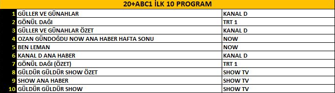 ABC1 grubunda da tablo değişmedi. “Güller ve Günahlar” dizisi, yayınlandığı bölümle izleyiciden yoğun ilgi görerek gecenin en çok izlenen yapımı olmayı başardı ve liderliğini korudu. Uzun soluklu başarısıyla dikkatleri üzerine çeken “Gönül Dağı” dizisi, güçlü izleyici kitlesi sayesinde ikinci sırada yer aldı. “Güller ve Günahlar” dizisinin özet bölümü ise ana bölümün ardından gösterdiği performansla üçüncü sıraya yükselerek dizinin gün boyunca süren etkisini reyting listelerine yansıttı.