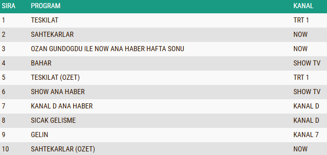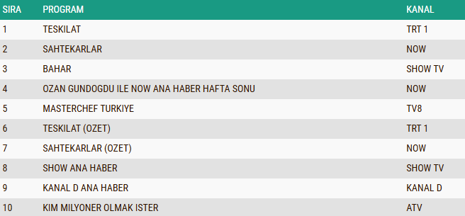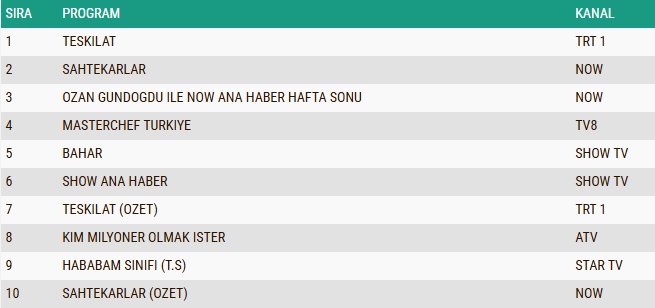 ABC1 kategorisinde de reyting tablosu dikkat çekici sonuçlar ortaya koydu. Aksiyon ve gerilim dozu yüksek bölümüyle Teşkilat dizisi, bu grupta da günün en çok izlenen yapımı olarak birinciliğe yerleşti. Güçlü hikâyesiyle izleyicinin ilgisini canlı tutan Sahtekarlar isimli sevilen dizi, ikinci sırada kendine yer buldu. Duygusal anlatımıyla öne çıkan Bahar dizisi ise ABC1 grubunda üçüncü sıraya yerleşerek pazar akşamının öne çıkan yapımları arasında yer aldı.