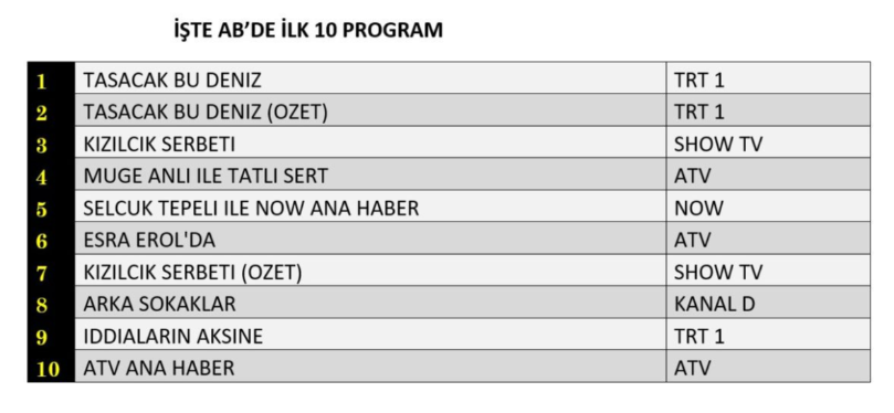 Öte yandan "Taşacak Bu Deniz"in özet bölümü bile ilgi görerek üçüncü sıraya yerleşti. Bu durum dizinin sadece yeni bölümleri ile değil, tekrar yayınlarıyla da izleyici sadakatini sürdürdüğünü gösteriyor.