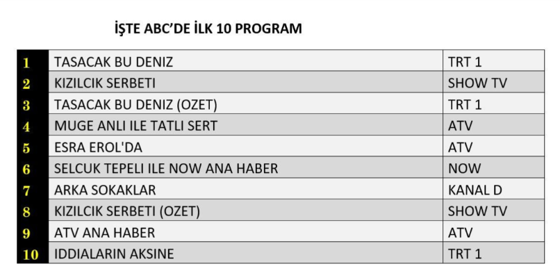 ABC1 kategorisinde "Taşacak Bu Deniz" yine rakipsizdi ve gecenin zirvesine adını yazdırdı. İzleyiciyi ekrana kilitleyen güçlü hikaye akışı ve duygusal sahneleri sayesinde dizi, birinciliği kimseyle paylaşmadı.