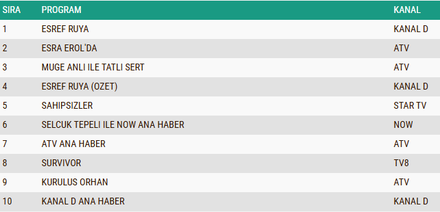 AB izleyici grubunda da reyting rekabeti dikkat çekerken, “Eşref Rüya” dizisi yayınlanan bölümüyle listenin zirvesine yerleşti. Başarılı performansını devam ettiren yapım, AB kategorisinde günü birinci sırada tamamlamışken, gündüz kuşağının sevilen programlarından “Müge Anlı ile Tatlı Sert” sabah programı ikinci sıraya yükseldi. Uzun soluklu yarışma programı “Survivor” ise istikrarlı izlenme oranlarıyla üçüncü basamakta yer alarak ilk üçte kendine yer buldu.