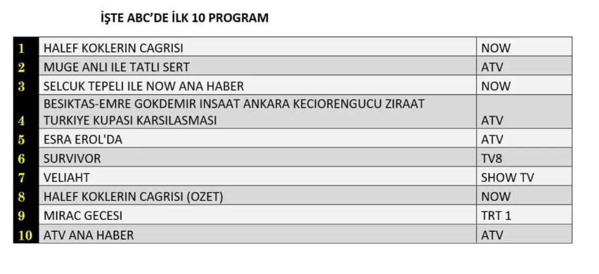 ABC1 izleyici grubunda da günün en çok izlenen yapımı “Halef: Köklerin Çağrısı” dizisi oldu ve zirvedeki yerini korudu. Yayınlanan bölümüyle dikkatleri üzerine çeken dizi, ABC1 kategorisinde birinci sıraya yerleşerek güçlü performansını sürdürdü. Gündüz kuşağının uzun soluklu ve istikrarlı programı “Müge Anlı ile Tatlı Sert”, yüksek izlenme oranlarıyla ikinci sırada yer alırken, günün ön plana çıkan haber bültenlerinden “Selçuk Tepeli ile Now Ana Haber” ise ABC1 listesinde üçüncü basamakta kendine yer buldu.