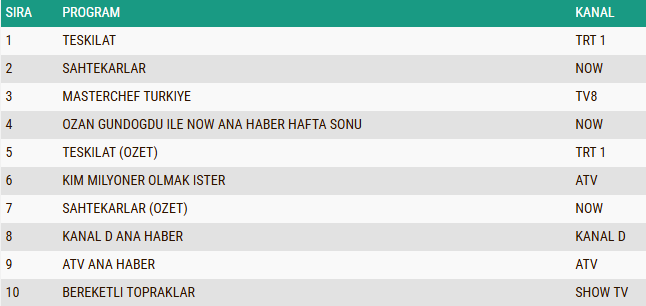 16 Kasım 2025 pazar akşamı Teşkilat dizisi ekranda adeta fırtına gibi esti! Aksiyon dolu sahneleri ve yüksek temposu ile seyirciyi yine ekran başına kilitleyen dizi, reyting yarışında adeta rakip bırakmadı. Sadece Total kategorisinde değil, AB ve ABC1 gruplarında da zirveye yerleşerek tüm izleyici kategorilerinde günü birincilikle tamamladı. Bu şekilde "Teşkilat" dizisi haftanın en çok izlenen yapımı olma ünvanını bir kez daha pekiştirdi. Her bölümde temposunu yükselten dizinin, önümüzdeki haftalarda da bu başarısını devam ettirmesi bekleniyor. Konuya dair tüm detaylar haberimizde...