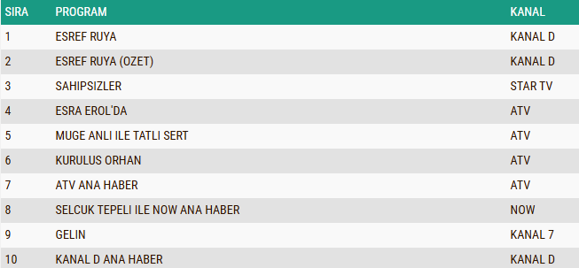17 Aralık 2025 Çarşamba akşamına ait reyting verileri netleşti. Total kategorisinde izleyicinin en çok tercih ettiği yapım “Eşref Rüya” olurken, dizinin özet bölümü de güçlü performansıyla ikinci sıraya yerleşti. Gecenin dikkat çeken yapımlarından “Sahipsizler” dizisi ise istikrarlı izlenme oranlarıyla listeyi üçüncü sırada tamamlayarak ilk üçte kendine yer bulmayı başardı.