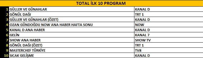 ABC1 izleyici grubunda da gecenin en çok izlenen yapımı “Güller ve Günahlar” isimli dizi oldu. Yeni bölümüyle ekranlara gelen dizi, ABC1 kategorisinde birinci sıraya yerleşerek zirvedeki yerini korudu. Uzun süredir yayın hayatını sürdüren ve geniş bir izleyici kitlesine sahip olan “Gönül Dağı” dizisi, istikrarlı performansıyla ikinci sırada yer aldı. Günün öne çıkan haber bültenlerinden “Ozan Gündoğdu ile NOW Ana Haber Hafta Sonu” ise ABC1 listesinde üçüncü basamakta kendine yer buldu.