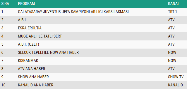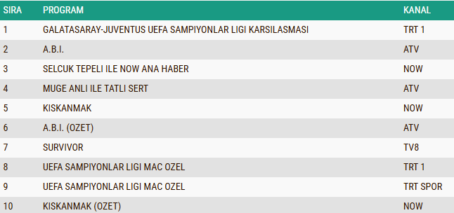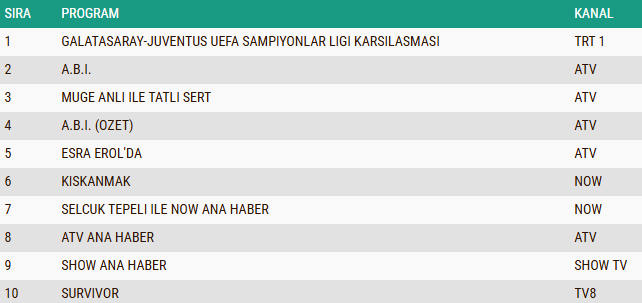 ABC1 izleyici grubunda da 17 Şubat 2026 tarihli reyting sonuçları sporun damga vurduğu bir tablo ortaya koydu. “Galatasaray–Juventus UEFA Şampiyonlar Ligi Karşılaşması” kategoride ilk sıraya yerleşerek gecenin en çok izlenen yapımı oldu. Onu ikinci sırada “A.B.İ.” dizisi takip ederken, gündüz kuşağının uzun soluklu programlarından “Müge Anlı ile Tatlı Sert” sabah programı ise üçüncü basamakta kendine yer buldu.