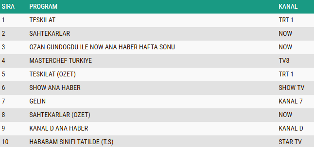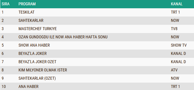 AB izleyici grubunda da gecenin en çok izlenen yapımı “Teşkilat” dizisi oldu. Yayınlanan bölümüyle güçlü bir performans sergileyen dizi, AB kategorisinde zirveye yerleşerek günü birinci sırada tamamladı. Suç ve dram unsurlarını bir araya getiren iddialı dizi “Sahtekarlar”, izleyiciden gördüğü ilgiyle ikinci sırada yer alırken; uzun süredir ekranlarda olan ve geniş bir izleyici kitlesine sahip “MasterChef Türkiye” yarışma programı ise AB grubunda üçüncü basamakta kendine yer buldu.
