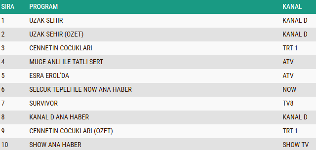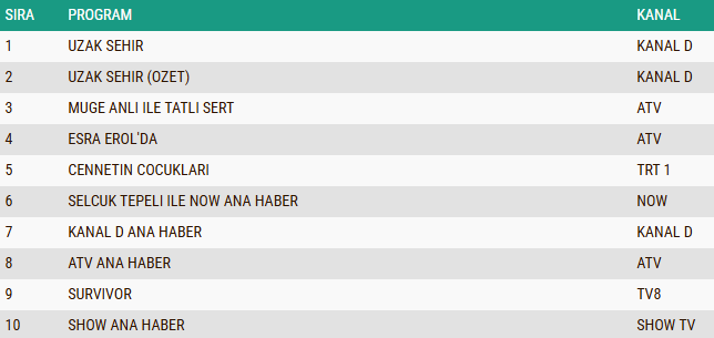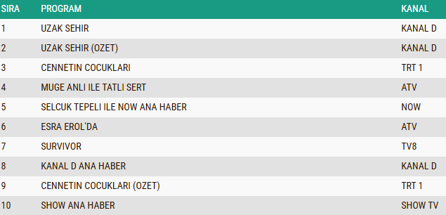 ABC1 izleyici grubunda da zirvede yine “Uzak Şehir” dizisi yer aldı; güçlü hikâyesi, akıcı anlatımı ve dikkat çeken sahneleriyle yayınlanan yeni bölümü günün en çok izlenen yapımı olmayı başardı. Dizinin hemen ardından ekrana gelen “Uzak Şehir (Özet)” ise diziyi kaçıran ya da yeniden izlemek isteyen izleyicilerin yoğun ilgisiyle ikinci sıraya yerleşti ve yapımın bu kategorideki gücünü bir kez daha ortaya koydu. Akşam kuşağında yayınlanan “Cennetin Çocukları” isimli yeni sezon dizisi ise düzenli izleyici kitlesinin desteğiyle ABC1 grubunda üçüncü sırada yer alarak reyting yarışında kendine sağlam bir yer edinmeyi başardı.
