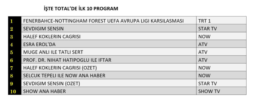 19 Şubat 2026 Perşembe gününe ait reyting sonuçları kamuoyuyla paylaşıldı. Total kategorisinde futbol heyecanı zirveye taşınırken, “Fenerbahçe-Nottingham Forest UEFA Avrupa Ligi Karşılaşması” günün en çok izlenen yayını olarak birinci sırada yer aldı. Spor karşılaşmasının ardından ikinci basamakta “Sevdiğim Sensin” isimli yeni dizi bulunurken, üçüncü sırayı ise “Halef Köklerin Çağrısı” dizisi elde etti. Açıklanmış olan bu reyting verileri, perşembe akşamı hem spor yayınlarının hem de dizilerin izleyici nezdinde yoğun ilgi gördüğünü ortaya koydu.
