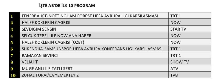 AB izleyici grubunda da 19 Şubat 2026 Perşembe akşamının reyting sonuçları sporun üstünlüğünü ortaya koydu. “Fenerbahçe-Nottingham Forest UEFA Avrupa Ligi Karşılaşması” bu kategoride de zirveye yerleşerek gecenin en çok izlenen yayını oldu. İkinci sırada “Halef Köklerin Çağrısı” dizisi yer alırken, üçüncü basamakta ise “Sevdiğim Sensin” adlı yeni dizi kendine yer buldu. Reyting sonuçları, AB grubunda futbol karşılaşmasının açık ara ön plana çıktığını, diziler arasındaki rekabetin ise sıralamada belirleyici olduğunu gösterdi.