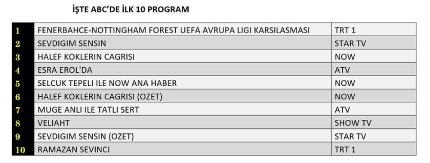 19 Şubat 2026 Perşembe gününe ait ABC1 reyting verileri, akşamın galibini net biçimde ortaya koydu. “Fenerbahçe-Nottingham Forest UEFA Avrupa Ligi Karşılaşması” bu kategoride en yüksek izlenme oranına ulaşarak listenin ilk sırasında yer aldı. İkinci sırada “Sevdiğim Sensin” dizisi bulunurken, “Halef Köklerin Çağrısı” dizisi ise üçüncü basamakta kendine yer buldu. Bu şekilde ABC1 grubunda spor yayını zirveye yerleşirken, diziler arasındaki rekabet de dikkat çekici bir tablo oluşturdu.