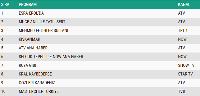 Total kategorisinde günün en çok izlenen programı “Esra Erol’da” oldu ve zirvenin sahibi olarak dikkat çekti. Onu, yüksek izlenme oranlarını istikrarlı şekilde sürdüren “Müge Anlı ile Tatlı Sert” programı takip etti. Akşam kuşağının güçlü yapımlarından “Mehmed: Fetihler Sultanı” dizisi ise günü üçüncü sırada tamamlayarak listede kendine sağlam bir yer edindi.