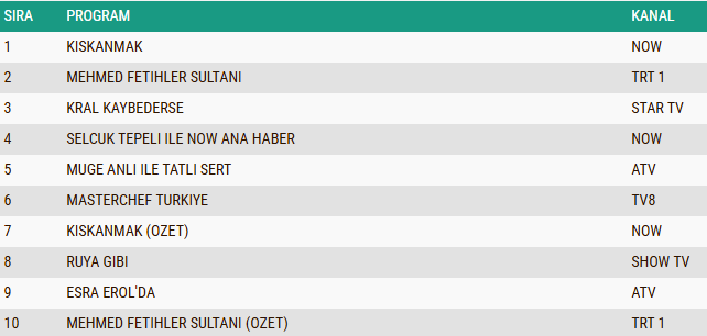 AB kategorisinde reyting yarışının kazananı “Kıskanmak” dizisi oldu. Dram yüklü sahneleri ve güçlü oyuncu kadrosuyla dikkat çeken dizi, Salı akşamının en çok izlenen yapımı olmayı başardı. Onun hemen ardından, tarihi atmosferi ve yüksek prodüksiyon kalitesiyle öne çıkan dizi “Mehmed: Fetihler Sultanı” ikinci sıraya yerleşti. Gecenin üçüncüsü ise psikolojik derinliği, karakter çatışmaları ve sürükleyici hikâyesiyle izleyiciyi ekrana bağlayan “Kral Kaybederse” dizisi oldu.