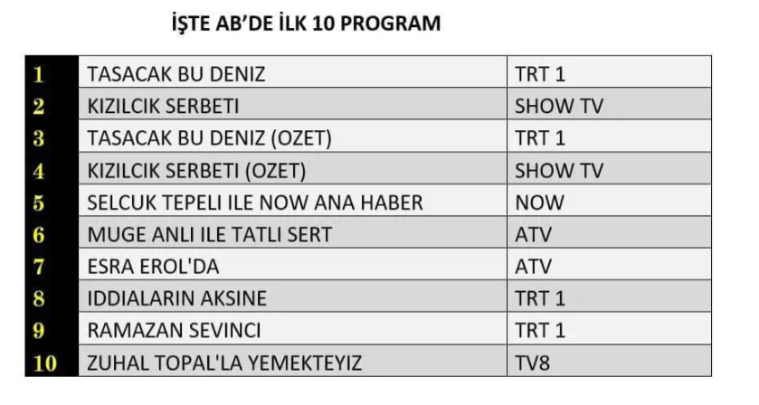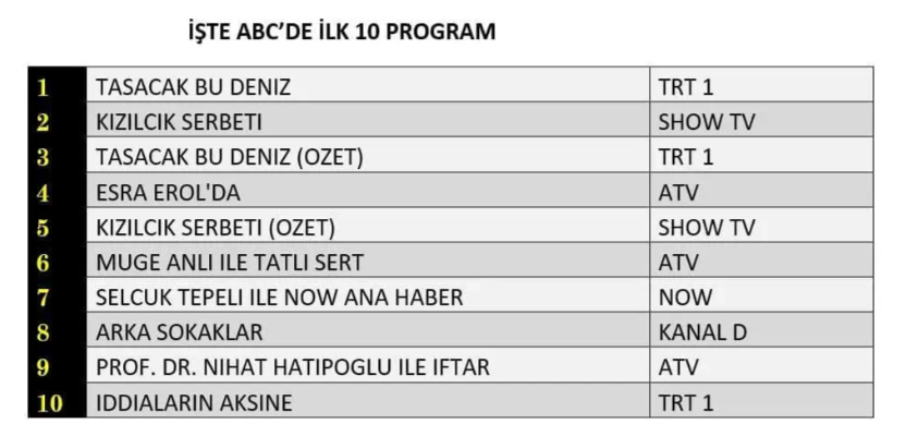 AB izleyici grubunda da tablo değişmedi ve akşamın en çok tercih edilen yapımı yine Taşacak Bu Deniz dizisi oldu. Sevilen dizi, hem hikâye akışı hem de karakter gelişimleriyle dikkatleri üzerine çekerek güçlü performansını bu kategoride de devam ettirdi. Onu, sadık izleyici kitlesini ekran başında tutmayı başaran Kızılcık Şerbeti dizisi takip ederken, yapımın tekrar bölümü niteliğindeki Taşacak Bu Deniz (Özeti) ise üçüncü sıraya yerleşerek listenin üst basamaklarında kalmayı başardı.