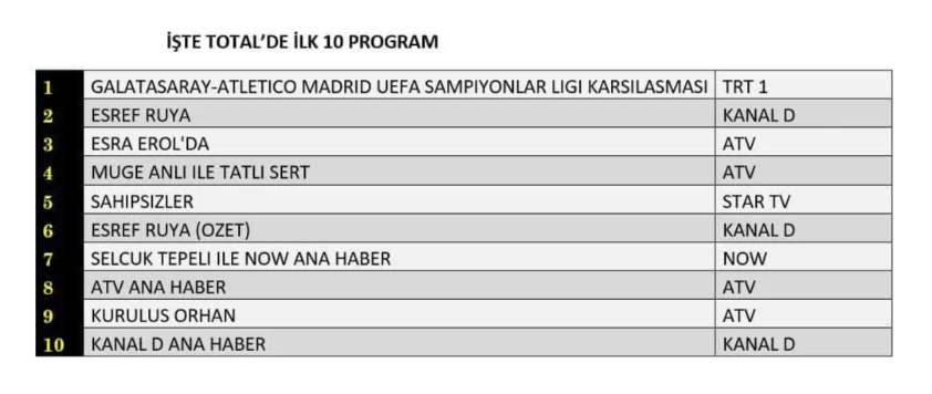 21 Ocak 2026 Çarşamba gününe ait reyting sonuçları kamuoyuyla paylaşılırken, Total izleyici grubunda akşam kuşağının galibi netleşti. Futbolseverlerin yoğun ilgisiyle ekrana gelen “Galatasaray-Atletico Madrid UEFA Şampiyonlar Ligi Karşılaşması”, yüksek izlenme oranlarıyla günü zirvede tamamlayarak lider oldu. Güçlü hikâyesi ve dikkat çeken sahneleriyle izleyiciyi ekran başına kilitleyen “Eşref Rüya” dizisi Total kategorisinde ikinci sıraya yerleşirken, dizinin hemen ardından yayınlanan “Eşref Rüya (Özet)” bölümü de aldığı reytinglerle üçüncü sırada kendine yer buldu.
