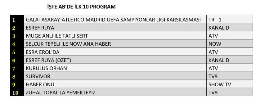 AB izleyici grubunda 21 Ocak 2026 Çarşamba gününün reyting tablosu da netleşti. Futbolseverlerin yoğun ilgisiyle ekrana gelen “Galatasaray-Atletico Madrid UEFA Şampiyonlar Ligi Karşılaşması”, yüksek izlenme oranlarıyla AB kategorisinde günü zirvede tamamladı. Akşam kuşağında güçlü hikâyesi ve etkileyici anlatımıyla dikkatleri üzerine çeken fenomen dizi “Eşref Rüya”, izleyiciden gördüğü ilgiyle ikinci sıraya yerleşti. Gündüz kuşağının uzun soluklu ve istikrarlı yapımlarından “Müge Anlı ile Tatlı Sert” sabah programı ise AB grubunda üçüncü sırayı alarak günün en çok izlenen programları arasında yer aldı.