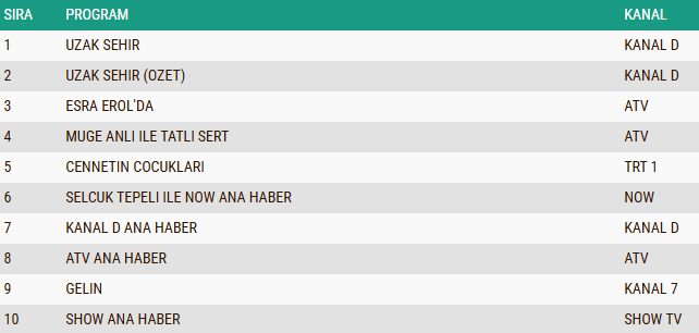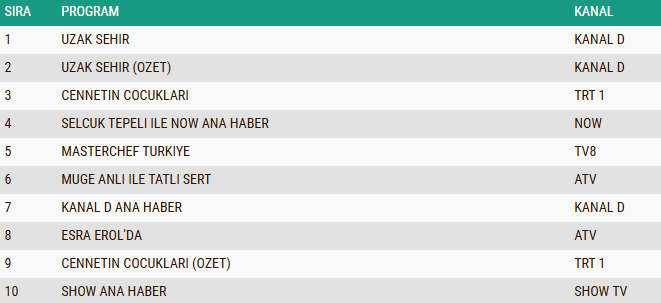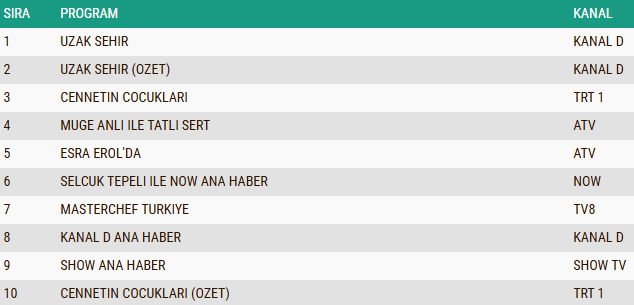 22 Aralık 2025 Pazartesi gününe ait reyting verileri paylaşıldı ve Total kategorisinde zirvenin sahibi değişmedi. Türk televizyon ekranlarında yayınlanan “Uzak Şehir”, güçlü izleyici ilgisiyle gecenin en çok izlenen yapımı olarak ilk sıraya yerleşirken, dizinin hemen ardından ekrana gelen özet bölümü de yüksek izlenme oranıyla ikinci sırada kendine yer buldu. Günün üçüncüsü ise gündüz kuşağında istikrarlı performansını sürdüren ve geniş bir izleyici kitlesine ulaşan program “Esra Erol’da” oldu. Bu sonuçlara göre Pazartesi akşamı Total grubunda “Uzak Şehir” rüzgârı eserken, dizi ve programların kıyasıya rekabeti reyting tablosuna net şekilde yansıdı.
