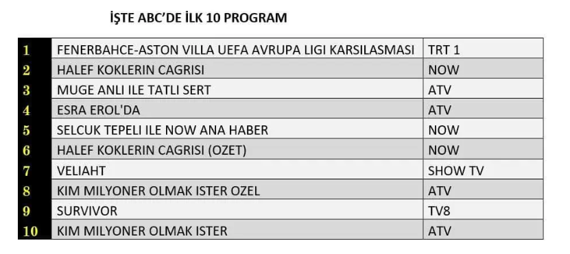 ABC1 izleyici grubunda 22 Ocak 2026 Perşembe gününün reyting sonuçları da netleşti. Futbolseverlerin yoğun ilgi gösterdiği “Fenerbahçe-Aston Villa UEFA Avrupa Ligi Karşılaşması”, elde ettiği yüksek izlenme oranlarıyla ABC1 kategorisinde de günü zirvede tamamladı. Akşam kuşağında dikkatleri üzerine çeken yapımlardan “Halef: Köklerin Çağrısı” isimli yeni sezon dizisi, izleyiciden gördüğü ilgiyle ikinci sıraya yerleşirken, gündüz kuşağının güçlü ve istikrarlı programı “Müge Anlı ile Tatlı Sert” ise ABC1 grubunda üçüncü sıranın sahibi oldu.