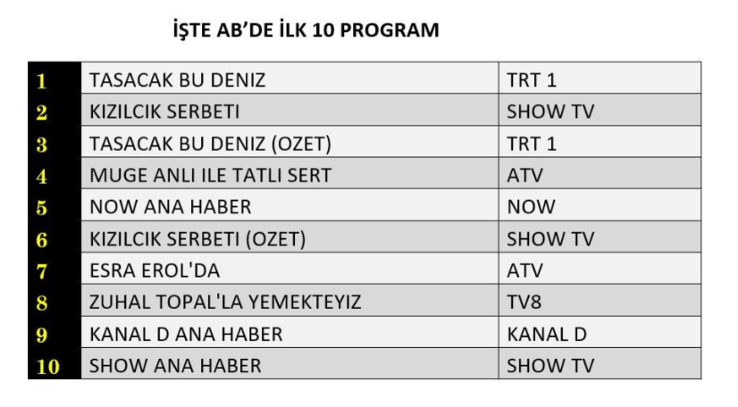 AB izleyici grubunda 23 Ocak 2026 Cuma gününün reyting tablosu da belli oldu. Yayınlandığı akşam izleyiciden yoğun ilgi gören “Taşacak Bu Deniz” isimli fenomen dizi, güçlü performansını sürdürerek AB kategorisinde de zirvenin sahibi olmayı başardı. “Kızılcık Şerbeti” dizisi istikrarlı izlenme oranlarıyla ikinci sırada yer alırken, ana bölümün ardından ekrana gelen “Taşacak Bu Deniz (Özet)” ise AB grubunda üçüncü sıraya yerleşerek gecenin en çok izlenen yapımları arasında yer aldı.