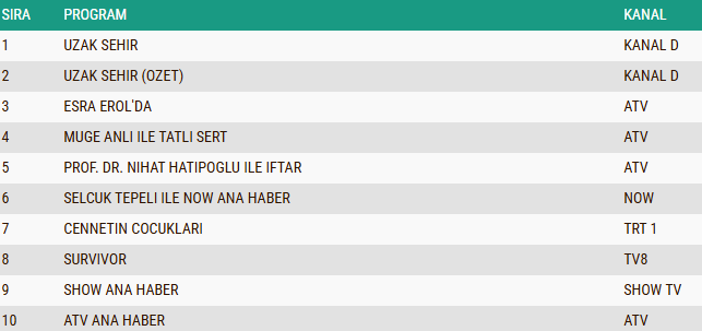 23 Şubat 2026 Pazartesi gününe ait reyting sonuçları belli oldu ve Total kategorisinde zirve yarışının kazananı netleşti. İkinci sezonuyla ekran yolculuğunu devam ettiren Uzak Şehir dizisi, güçlü hikâye akışı ve karakterler arasındaki derin çatışmalarla izleyiciyi ekran başına toplayarak günü birinci sırada tamamladı. Dizinin tekrar bölümü niteliğindeki Uzak Şehir (Özet) ise ana bölümün hemen ardından ikinci sıraya yerleşerek yapımın başarısını pekiştirdi. Gündüz kuşağının dikkatleri üzerine çeken programlarından Esra Erol’da da üçüncü sırada yer alarak güçlü izlenme oranları elde etti.