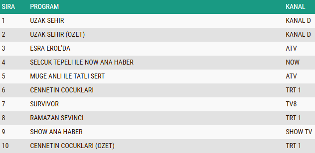 ABC1 kategorisinde de 23 Şubat 2026 Pazartesi gününün reyting sonuçları zirvede değişiklik olmadığını gösterdi. İkinci sezonuyla izleyici karşısına çıkan Uzak Şehir dizisi, bu grupta da en çok izlenen yapım olarak ilk sırada yer aldı. Dizinin tekrar bölümü olan Uzak Şehir (Özet) ikinci basamakta yer alarak yapımın başarısını pekiştirirken, gündüz kuşağının dikkatleri çeken programlarından Esra Erol’da ise üçüncü sıraya yerleşti.