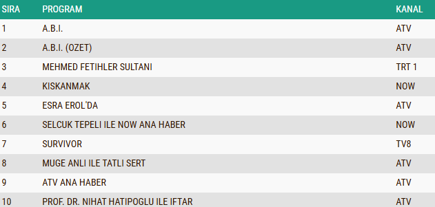 AB izleyici grubunda 24 Şubat 2026 Salı akşamının reyting tablosu da dikkat çekici sonuçlar ortaya koydu. Yeni bölümüyle ekranlara gelen A.B.İ. dizisi, bu kategoride de zirveye yerleşerek birincilik koltuğunu aldı. Tarihi atmosferi ve yüksek prodüksiyon kalitesiyle öne çıkan Mehmed Fetihler Sultanı dizisi ikinci sırada yer alırken, dizinin tekrar bölümü olan A.B.İ. (Özet) ise üçüncü sırada yer aldı.