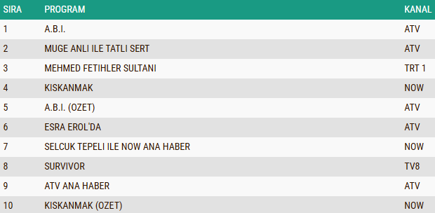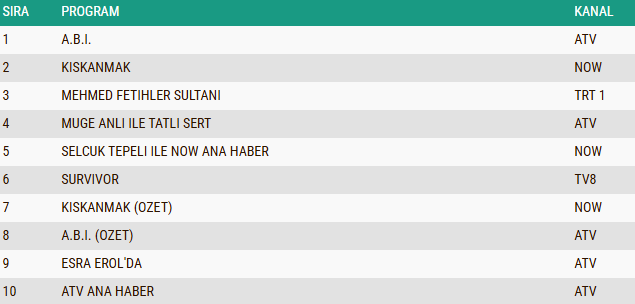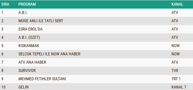 ABC1 izleyici grubunda günün reyting tablosu belli olurken, temposu yüksek kurgusu ve dikkat çeken hikâye akışıyla izleyicinin ilgisini zirveye taşıyan “A.B.İ.” dizisi birinci sıraya yerleşerek günün en çok izlenen yapımı oldu. Yıllardır ekranlarda yer alan, ele aldığı çarpıcı olaylar ve güçlü sunumuyla sadık bir izleyici kitlesine sahip olan “Müge Anlı ile Tatlı Sert” sabah programı ikinci sırada yer alarak istikrarlı başarısını sürdürürken, tarihsel anlatımı, yüksek prodüksiyon kalitesi ve etkileyici oyuncu performanslarıyla ön plana çıkan “Mehmed: Fetihler Sultanı” dizisi ise ABC1 kategorisinde üçüncü sırada yer alarak günün öne çıkan yapımları arasında kendine yer buldu.