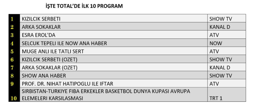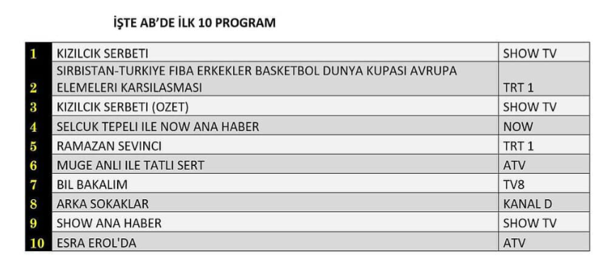 AB izleyici grubunda da Kızılcık Şerbeti dizisi başarısını devam ettirdi ve günü birinci sırada tamamladı. Dizinin güçlü hikâyesi ve yüksek izlenme oranı dikkatleri üzerine çekti. İkinci sırada Sırbistan-Türkiye FIBA Erkekler Basketbol Dünya Kupası Avrupa Elemeleri karşılaşması yer aldı. Milli maç, AB grubunda geniş bir izleyici kitlesine ulaştı. Üçüncü sıraya ise “Kızılcık Şerbeti (Özet)” yerleşti.