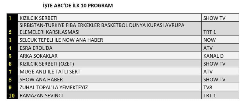 ABC1 izleyici kategorisinde Kızılcık Şerbeti isimli fenomen dizi zirvedeki yerini korudu ve birincilik tahtını bırakmadı. İlgi ile izlenen dizi, bu grupta da en çok izlenen yapım olmayı başardı. İkinci sırada Sırbistan-Türkiye FIBA Erkekler Basketbol Dünya Kupası Avrupa Elemeleri karşılaşması yer aldı ve milli maç geniş ilgi gördü. Üçüncü sıraya ise Selçuk Tepeli ile Now Ana Haber yerleşti.
