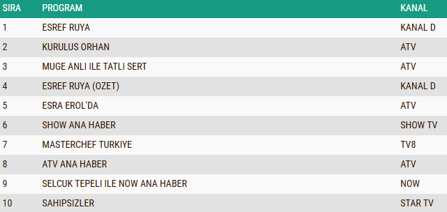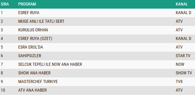 ABC1 reyting sonuçları, diziler ve çeşitli televizyon programlarının izleyiciler üzerinde belirgin bir etki yarattığını gösterdi. Zirvede özellikle Kanal D ve ATV'nin sevilen yapımları yer alırken, haber ve magazin içerikleri de güçlü performansları ile öne çıktı. Gecenin en çok izlenen yapımları arasında yer alan bu programlar, seyircilerin ilgi ve beğenisini büyük ölçüde toplamayı başardı.