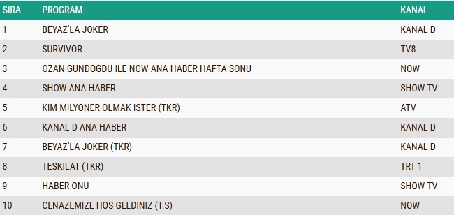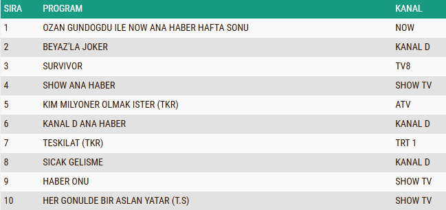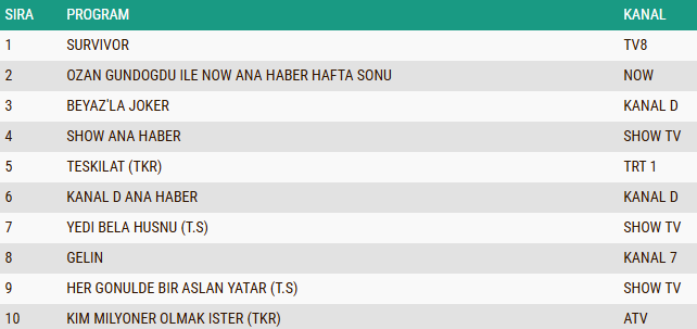 4 Ocak 2026 Pazar gününe ait reyting sonuçları belli olurken, Total izleyici grubunda günün kazananları da netleşti. Uzun zamandır yüksek izlenme oranlarıyla dikkatleri üzerine çeken yarışma programı Survivor, Pazar akşamı da güçlü performansını devam ettirerek zirvedeki yerini korudu ve gecenin en çok izlenen yapımı olmayı başardı. Günün ikinci sırasında, hafta sonunun öne çıkan gelişmelerini izleyiciyle buluşturan Ozan Gündoğdu ile NOW Ana Haber Hafta Sonu yer aldı. Eğlence formatları arasında öne çıkan Beyaz’la Joker ise keyifli atmosferi ve enerjik sunumuyla Total grubunda üçüncü sıraya yerleşerek Pazar gecesine damga vuran yapımlar arasında yer aldı.