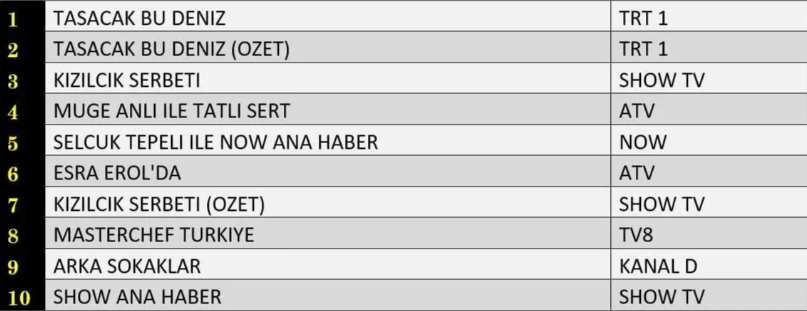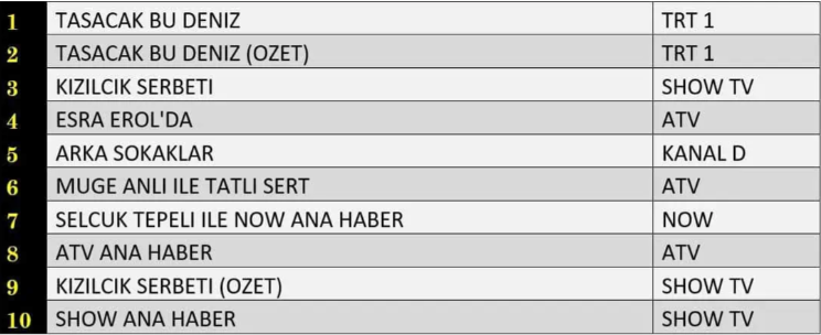 ABC kategorisinde reytinglerin zirvesi yine “Taşacak Bu Deniz” dizisi oldu. Dizi, prime-time performansıyla rakiplerini geride bırakarak günün en çok izlenen yapımı olmayı başardı.