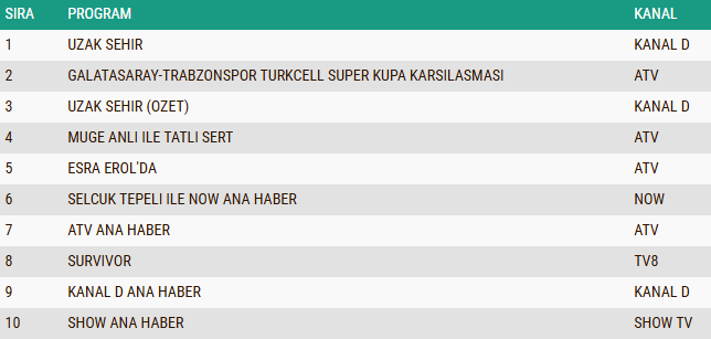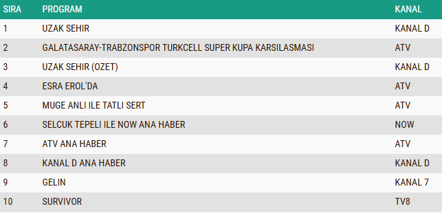 6 Ocak 2026 Pazartesi gününe ait reyting sonuçları belli olurken, izleyici ilgisinin hangi yapımlarda yoğunlaştığı da netlik kazandı. Total grubunda zirvenin sahibi, güçlü hikâyesi ve sadık izleyici kitlesiyle öne çıkan “Uzak Şehir” dizisi oldu. Dizinin yeni bölümü akşam kuşağında en çok izlenen yapım olarak listenin ilk sırasına yerleşirken, futbolseverleri ekran başına toplayan Galatasaray–Trabzonspor Türkcell Süper Kupa karşılaşması ikinci sırada kendine yer buldu. Gecenin üçüncü sırasında ise “Uzak Şehir” dizisinin özet bölümü yer aldı.