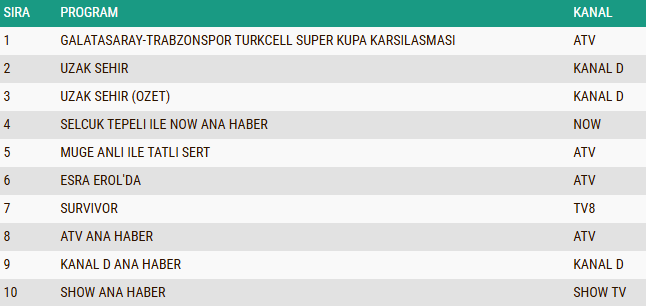 AB izleyici grubunda 6 Ocak 2026 Pazartesi akşamının reyting tablosu spor ve dizi rekabetini açık şekilde ortaya koydu. Listenin ilk sırasında, futbol tutkunlarını ekran başına kilitleyen Galatasaray–Trabzonspor Türkcell Süper Kupa karşılaşması yer aldı ve gecenin en çok izlenen yapımı olmayı başardı. İkinci sırada ise güçlü hikâyesi ve istikrarlı izleyici kitlesiyle dikkat çeken “Uzak Şehir” dizisi yer alırken, sevilen dizinin özet bölümü de yüksek ilgi görerek üçüncü sıraya yerleşti.