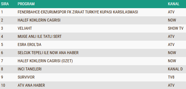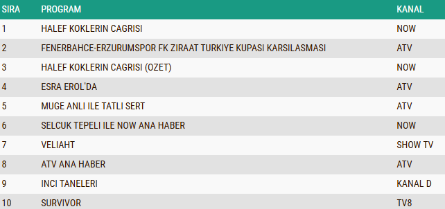 05 Şubat 2026 Perşembe gününe ait reyting sonuçları belli oldu. Total izleyici grubunda ekranların ilgiyle takip edilen yapımı “Halef: Köklerin Çağrısı” dizisi günü zirvede tamamlayarak birinci sıraya yerleşti. Spor karşılaşmalarının da güçlü bir izleyici kitlesiyle öne çıktığı günde, Fenerbahçe – Erzurumspor FK Ziraat Türkiye Kupası mücadelesi ikinci sırada kendine yer bulurken, dizinin tekrar bölümü olan “Halef: Köklerin Çağrısı (Özet)” ise üçüncü sıraya yükselerek yapımın gün boyunca yakaladığı izlenme başarısını bir kez daha ortaya koydu.