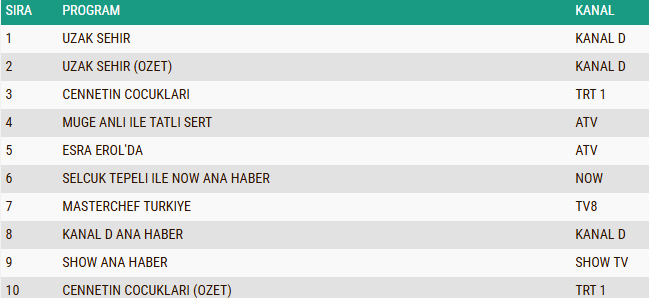 Özellikle yeni bölümüyle sosyal medyada çok konuşulan Uzak Şehir, hem hikâyesi hem oyunculuk performanslarıyla günün en çok izlenen yapımı olmayı başardı. Dizinin özet bölümünün bile ilk iki sırada yer alması, yapımın geniş bir izleyici kitlesi tarafından yakından takip edildiğini bir kez daha göstermiş oldu. Esra Erol’da ise gündemdeki konular ve programın dinamik temposu sayesinde pazartesi gününün yüksek rekabetli ortamında üst sıralara tutunmayı başardı.