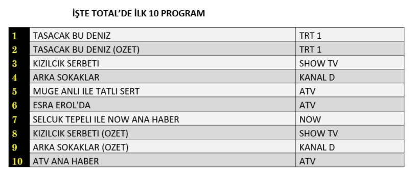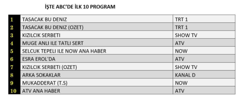 ABC1 kategorisinde de zirvenin adı değişmedi. “Taşacak Bu Deniz” isimli fenomen dizi, güçlü hikâyesi ve artan temposuyla izleyiciden yoğun ilgi görerek günün en çok izlenen yapımı oldu ve birinciliği açık ara elde etti. Dizinin ardından ekrana gelen özet bölümü, kaçıran izleyicilerin ilgisiyle ikinci sırada yer alarak başarısını pekiştirdi. Cuma akşamlarının öne çıkan yapımlarından “Kızılcık Şerbeti” dizisi ise istikrarlı izlenme oranlarıyla listede üçüncü sıraya yerleşti. Ortaya çıkmış olan bu tablo, “Taşacak Bu Deniz” dizisinin ABC1 izleyici grubunda da güçlü ve kalıcı bir izlenme performansı sergilediğini gösterdi.